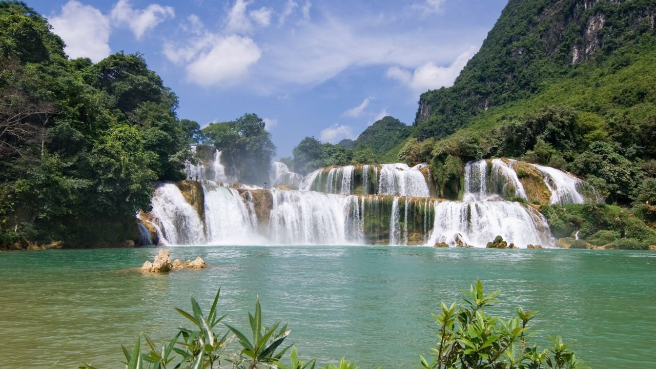 Straddling the border between Vietnam and China, Ban Gioc Falls is the largest waterfall in Vietnam and fourth-largest along a national border worldwide. The falls cascade down terraced limestone steps, creating a stunning multi-level display that changes dramatically with the seasons.