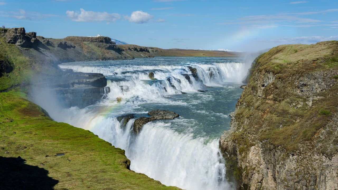 Gullfoss, or “Golden Falls,” is Iceland’s most famous waterfall and a crucial stop on the Golden Circle tourist route. This two-tiered beauty cascades down into a rugged canyon, and on sunny days, the mist creates spectacular rainbows that seem to dance in the air.